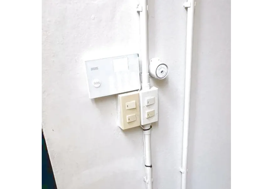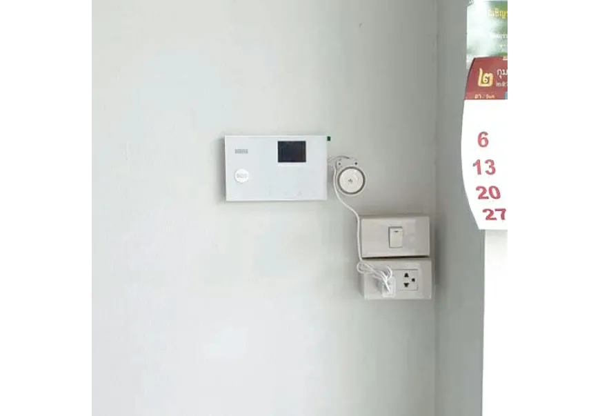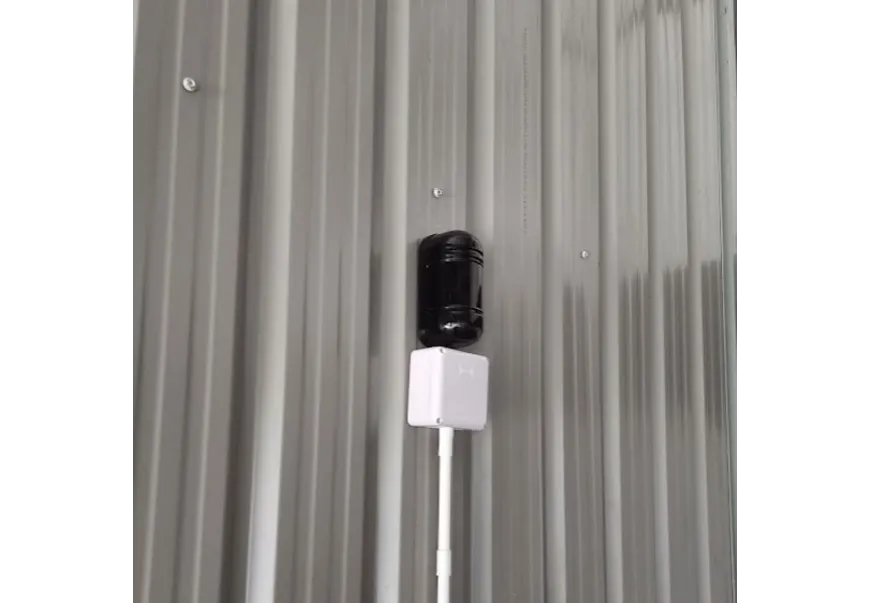 ไซเรนเสียงมีสาย SI04 สีขาวล้วนติดตั้งสวยงามกลมกลืนกับผนังอาคารสีขาว เซ็นเซอร์ตรวจจับความเคลื่..