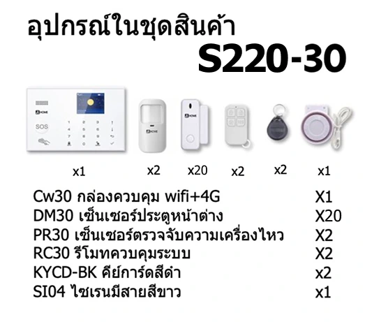 S220-30 ชุดสัญญาณกันขโมยบ้านไร้สายและบ้านอัจฉริยะ แจ้งเตือนผ่านการโทร3G-4G/แอพมือถือWifi/SMS ความเคลื่อนไหว2 ประตู20
