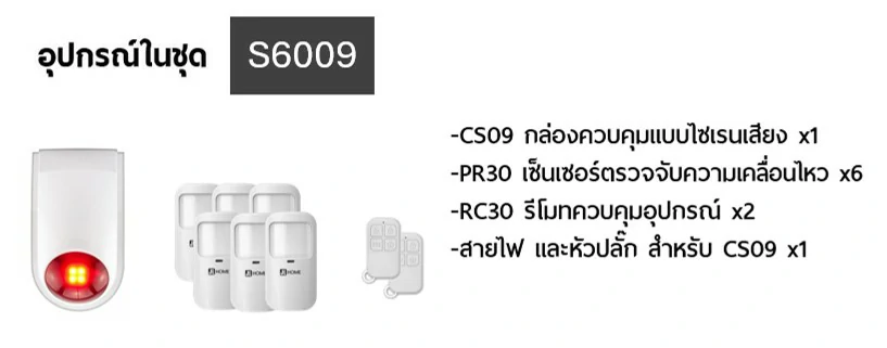 S6009 ชุดกล่องควบคุมไซเรน สัญญาณกันโมยบ้านไร้สาย ชุดเซ็นเซอร์ประตูเคลื่อนไหวx6 แจ้งเตือนผ่านแอพ ไม่ต้องมีกล่องควบคุมในบ้าน